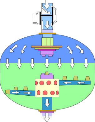 当系统处于过滤状态时,未经过滤的水通过上部的布水器,配合球形外壳,以接近平流的状态到达过滤器内的填料层。当水流过填料层时,杂质被截留在填料层内。过滤器底部的收集器将过滤后的水均匀地收集并流出。平流过滤,决定了过滤器在高的流速下过滤,仍可达到良好的过滤效果。